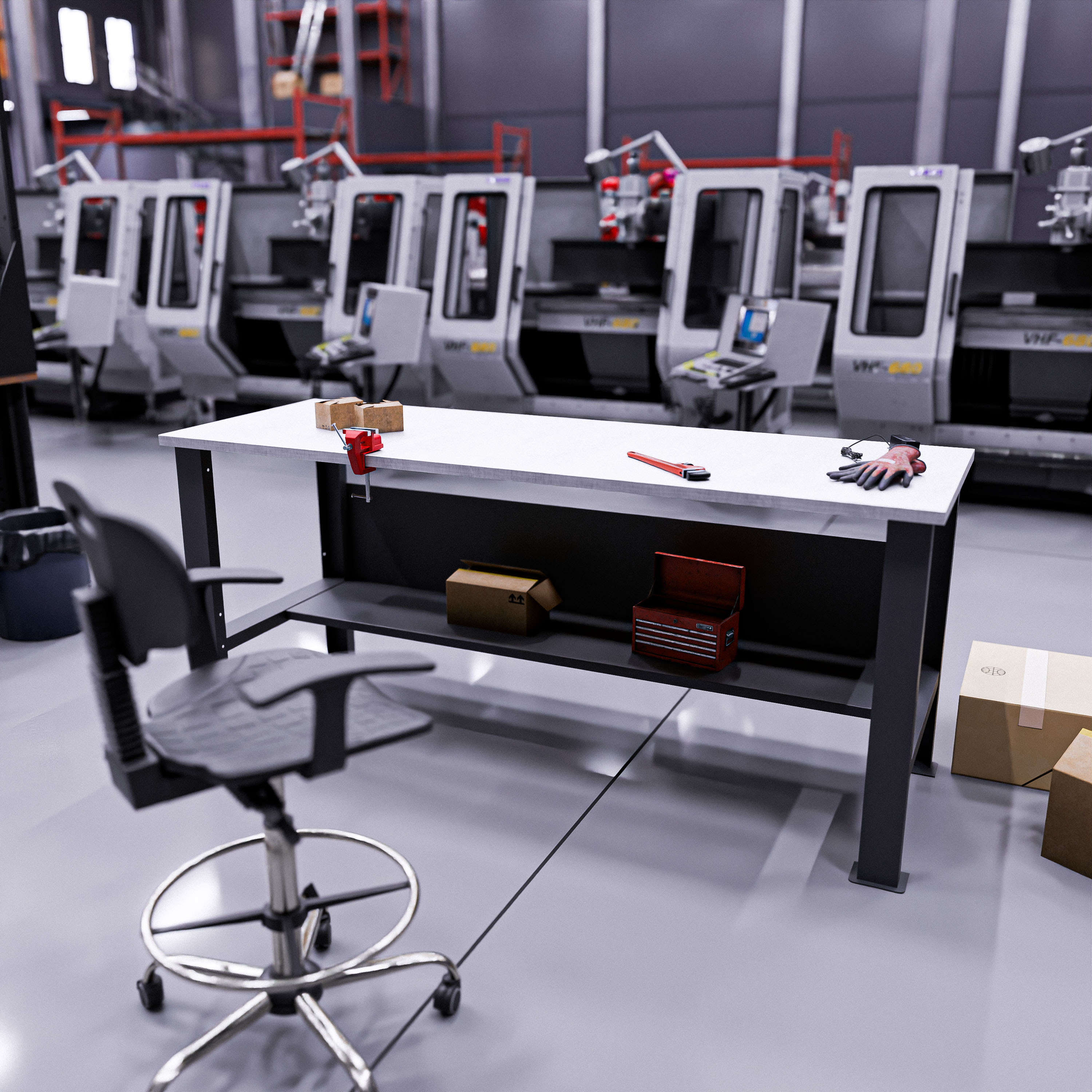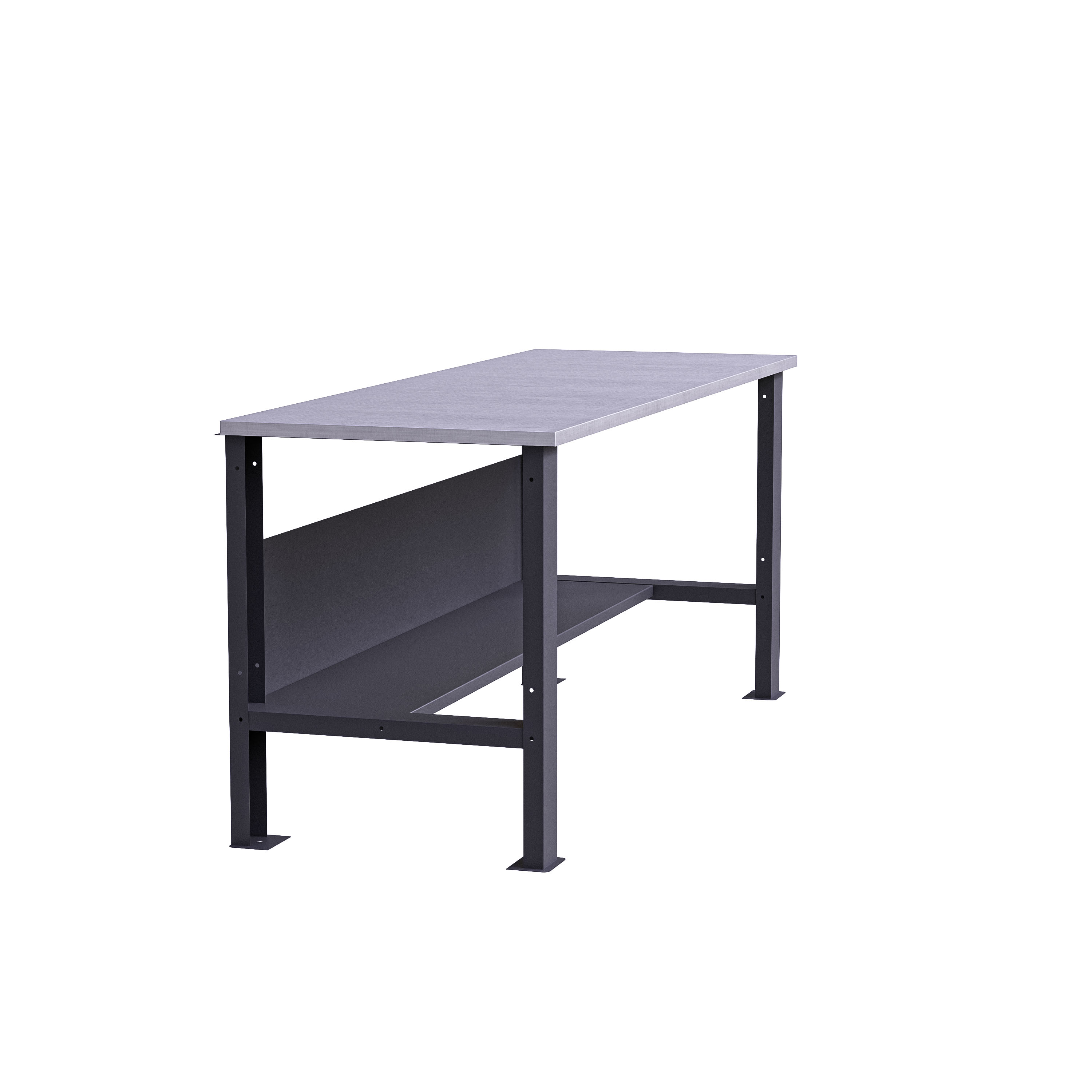 В данной комплектации верстак установлен на двух металлических опорах. Открытое пространство под столешницей обеспечивает свободный доступ к рабочей зоне и позволяет размещать под верстаком тару, оборудование, заготовки или мобильные элементы оснащения.