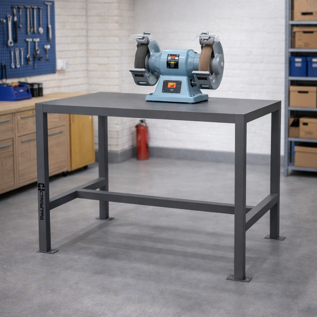 Подставка выполнена в виде усиленной стационарной металлической конструкции. Каркас изготовлен из стальной профильной трубы и рассчитан на повышенные эксплуатационные нагрузки, возникающие при работе настольных станков.